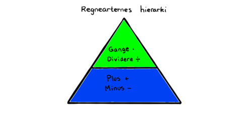 Når man laver regnestykker, hvor der indgår flere forskellige regneoperationer (for eksempel både gange og plus/minus), er det vigtigt, at man kender til regnearternes hieraki. Hierarki betyder en form for rangordning, altså hvad der er vigtigst. Med regnearternes hierarki mener man, hvilke regneoperationer, man skal udføre først. Hvis ikke man gør det i den rigtige rækkefølge, kan man nemlig risikere at komme frem til et resultat, der ikke passer. Trekanten her viser, hvordan hierarkiet for gange, dividere, plus og minus er: