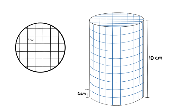 Nu har vi arealerne af top- og bundplader i tønden, men det vi gerne vil finde, er voluminet af tønden. Hvis vi nu forestiller os, at cirklerne inddelt i 908 små kvadrater hver, blev 1 cm høje. Der ville nu være 908 små terninger i stedet for kvadrater, med sidelængder 1cm x 1 cm x 1 cm. Det ville altså være simpelt at finde rumfanget af denne, vi skulle bare gange med dens højde på 1cm, og får så 908 cm3. Men tønden er ikke kun 1 cm høj - den er 60 cm høj, så vi skal lægge 60 af de små cirkelskiver ovenpå hinanden, for at det svarer til tønden. Det vil altså sige, at hvis vi skal finde volumenet af hele tønden, så skal vi gange arealet af cirklen med den nye højde, altså 60 cm: