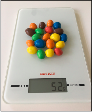 Ifølge vores måling vejer 20 m&m's 52g. Hvis vi dividerer denne vægt med 20, får vi gennemsnitsvægten for én m&m: