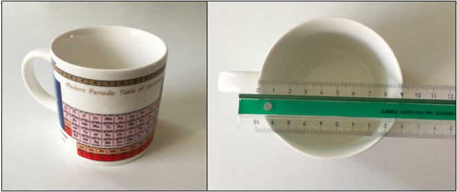 En måde at finde ud af, hvor mange m&m's der kan være i tønden, er selvfølgelig at fylde en hel tønde op med m&m's. Men det er rigtig mange m&m's man så skal bruge. Derfor har vi fundet en cylinderformet kop frem, som skal hjælpe os med at bestemme, hvor mange m&m's der er på et mindre volumen - og det kan så skaleres op til den store tønde. Koppen vi har brugt har en diameter på 9cm, den er 8,5cm høj, og herunder kan du se den: