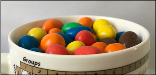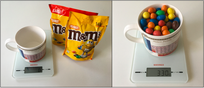 Der kan være 330g m&m's med peanuts i den cylinderformede kop. Hvis vi så ved hvor meget én m&m vejer, kan vi finde ud af, hvor mange m&m's der er i koppen. Når vi snakker om m&m's med peanuts, er der meget stor variation i størrelse og vægt mellem de enkelte m&m's. Vi er derfor nødt til at finde en gennemsnitsvægt. Desuden er en almindelig køkkenvægt ikke præcis nok til at veje enkelte m&m's, for eksempel ville en både en m&m på 1,6g og 2,4g se ud til at veje 2g. En god måde at finde gennemsnitsvægten er derfor at veje flere m&m's på en gang, og så dividere med det antal m&m's, man har vejet. Vi har valgt at veje 20 m&m's, og håber på, at deres spredning i vægt passer til spredningen i vægt i en hel pose m&m's. Du kan se resultatet af vejningen her: