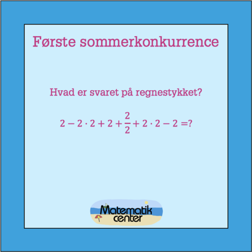 Den første sommerkonkurrence er et regnestykke, hvor man skal kende regnearternes hierarki for at løse det. Prøv at løse regnestykket uden lommeregner, eller læs videre efter billedet, hvis du har brug for et hint. Når du har et svar, kan du deltage i konkurrencen på vores Facebookside.