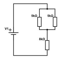 Vi ønsker at finde den samlede modstand i kredsløbet. Vi gør som ovenfor, og finder den totale modstand for de to \(5k\Omega\) modstande.