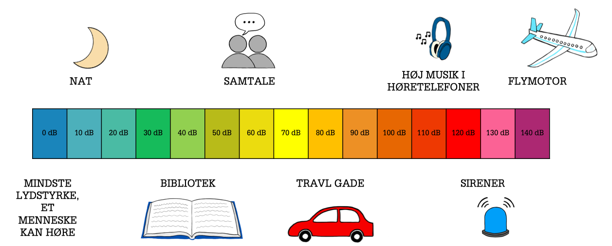 Hvis man ser en fordobling i lydstyrke, vil det svare til en stigning på tre decibel, uanset hvor på skalaen man er. 83 dB er altså dobbelt så højt som 80 db, og 26 er en dobbelt så høj lydstyrke som 23 dB. Det gælder også den anden vej - et fald på tre decibel, betyder en halvering i lydstyrke, fx er 40 dB det halve af 43 dB. På skalaen nedenfor kan du se, hvad forskellige lydstyrker svarer til: