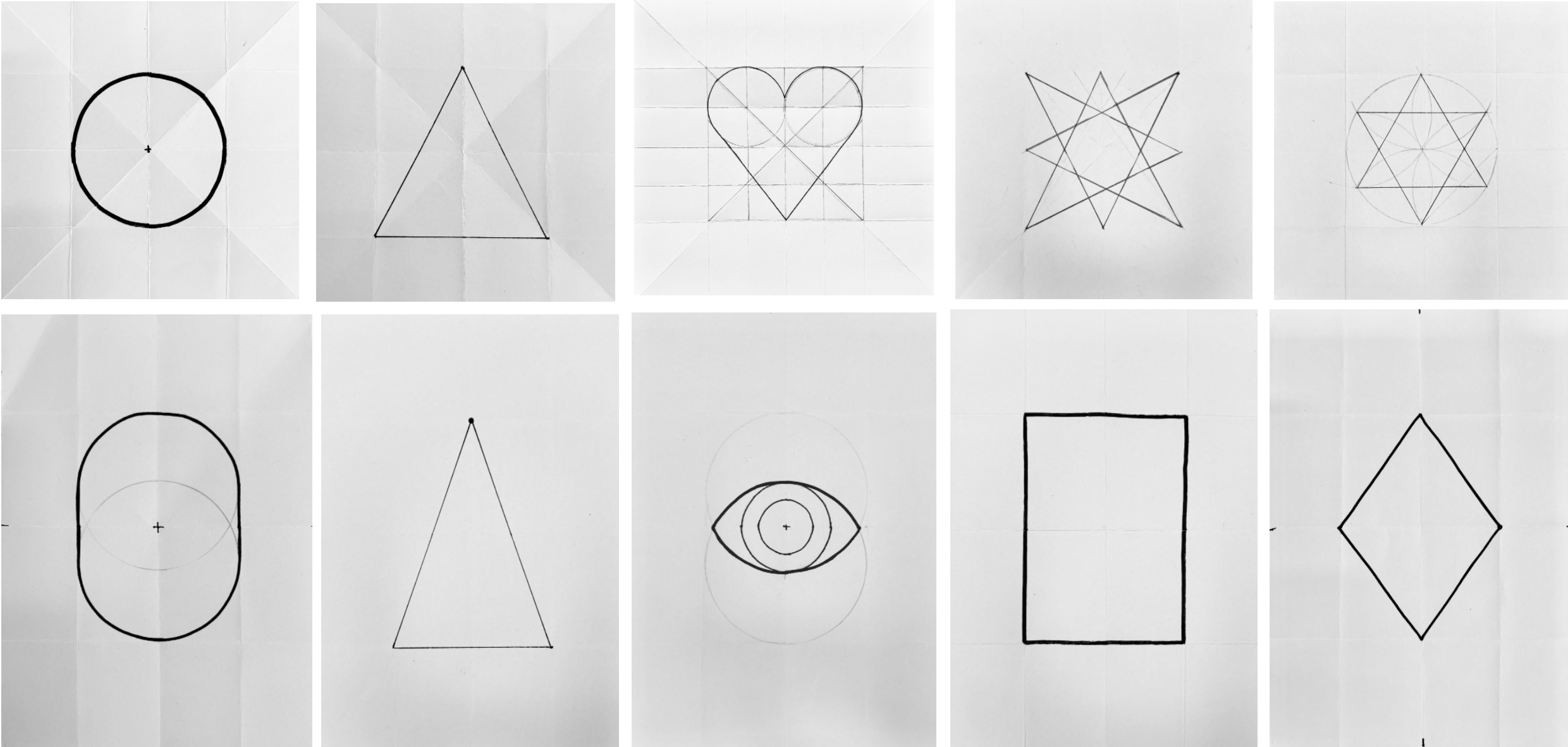Brug foldelinjerne og lineal, tegnetrekant med vinkelmåler og passer til at tegne forskellige geometriske figurer på grids. Tegn figurerne op med tusch og lav en fælles samling af forskellige geometriske figurer på grids, som kan bruges som inspiration senere i forløbet.