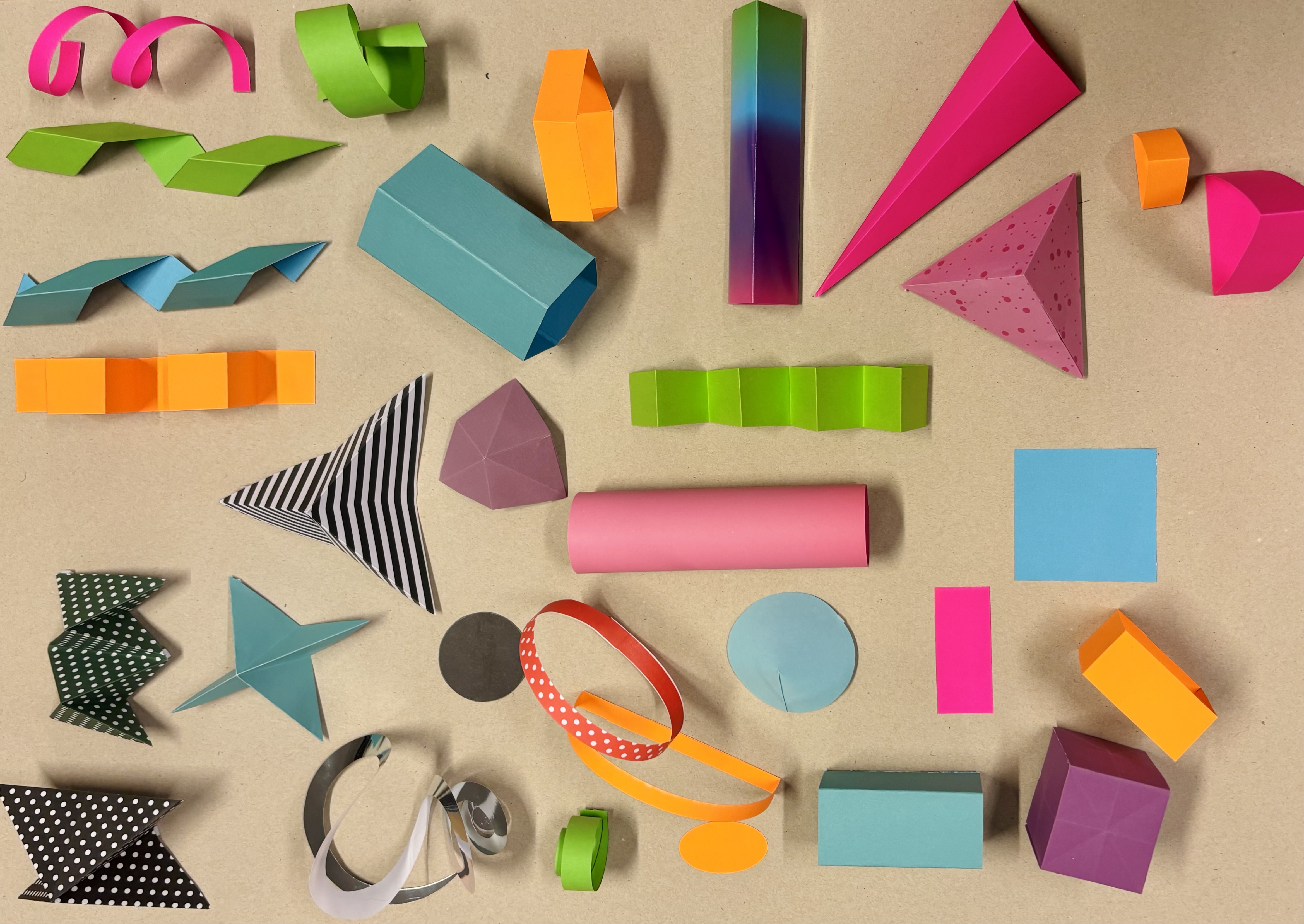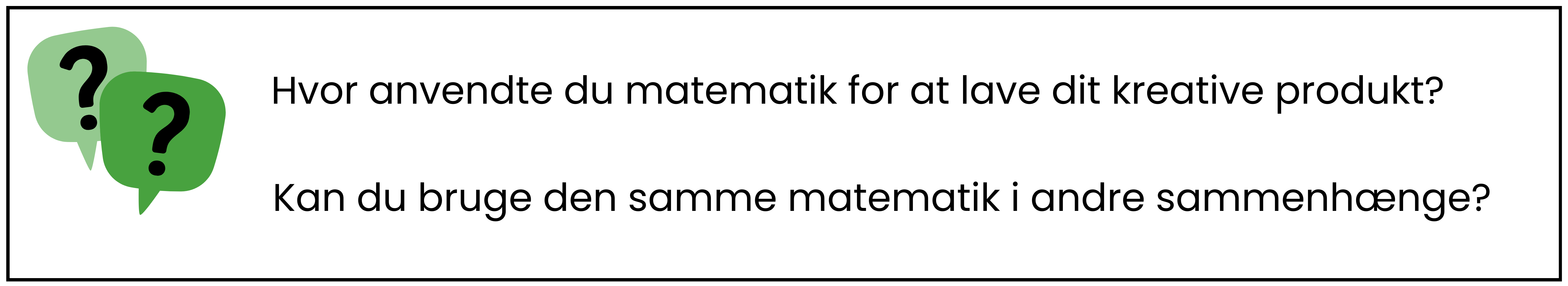 | Materialer | Karton i forskellige farver og mønstre, blyant, saks, lineal, tegnetrekant med vinkelmåler, passer, limstift, tape (evt. dobbeltklæbende), hæftetang. |