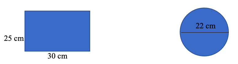 Du har fundet en opskrift på en kage, som er til en firkantet form i målene 25 x 30 cm. Du vil gerne bruge den opskrift, men du vil bage den i en rund form, der har en diameter på 22 cm.