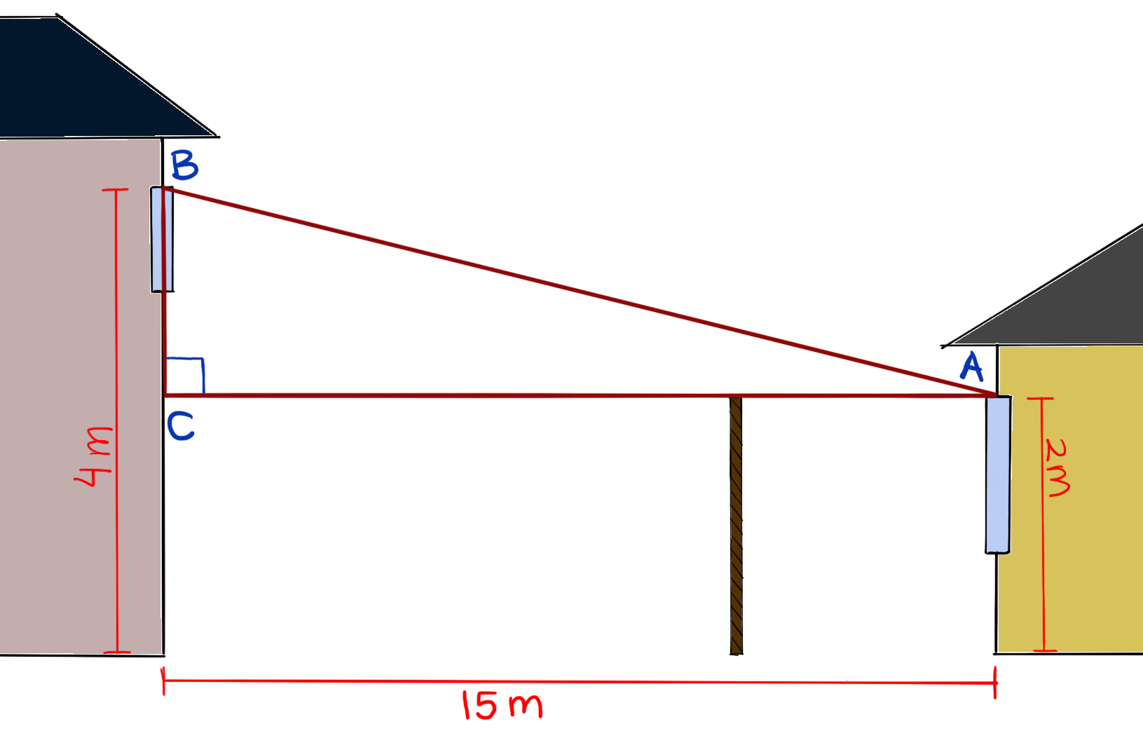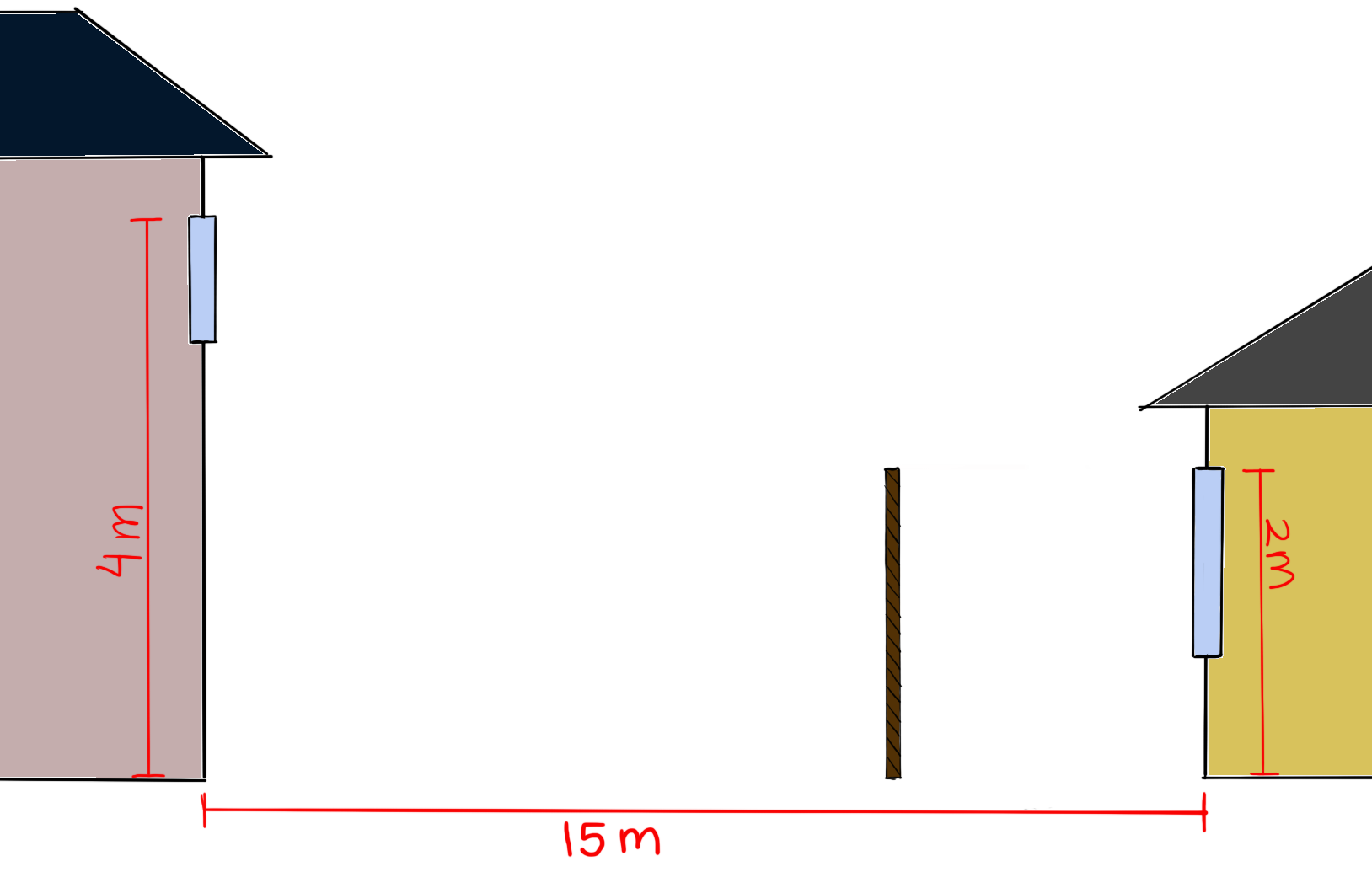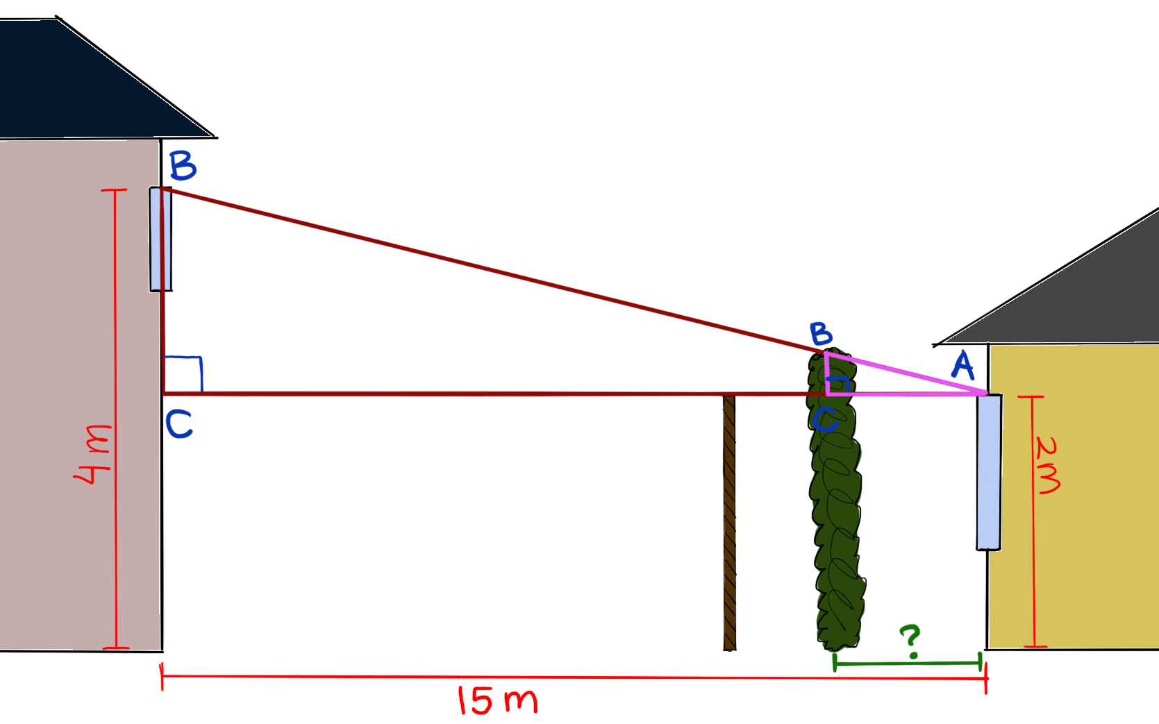 Der er 15 meter fra dit hus til huset overfor. Det højeste punkt på dit vindue er 2 meter oppe, og det højeste punkt på naboens er 4 meter oppe. Hvis vi vil finde ud af, hvor langt fra huset vi kan stille hækken, må vi bruge cosinus og sinus. Der kan indtegnes en retvinklet trekant mellem højeste punkt på dit vindue, vinkelret hen på naboens hus, og til det højeste punkt på deres hus, som vist på tegningen:
