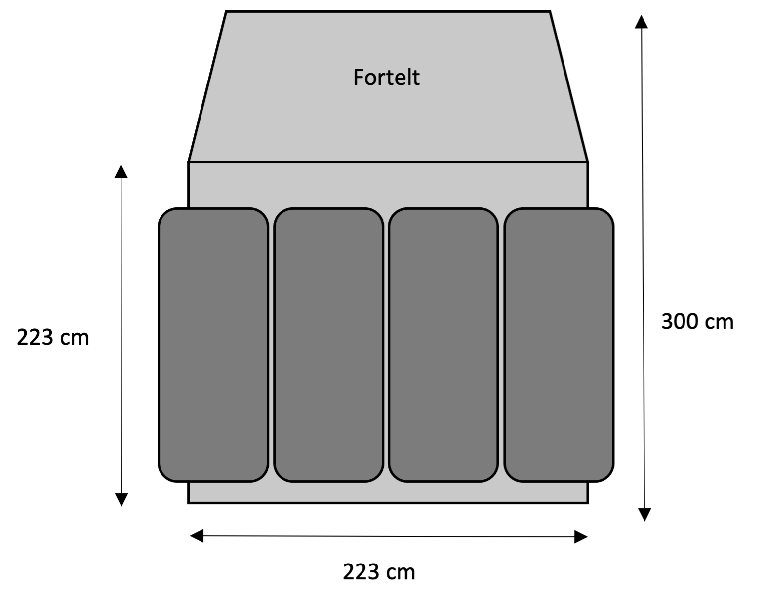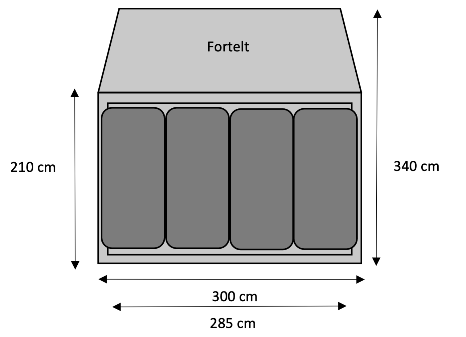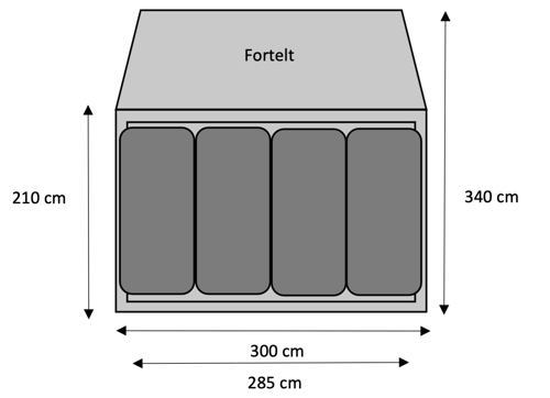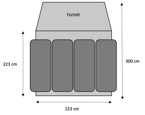 Og I kan derfor finde frem til, at de netop ikke kan ligge inden i teltet, selvom teltet som start oplyses til at være 300 cm bredt, når der ses bort fra inderteltet.