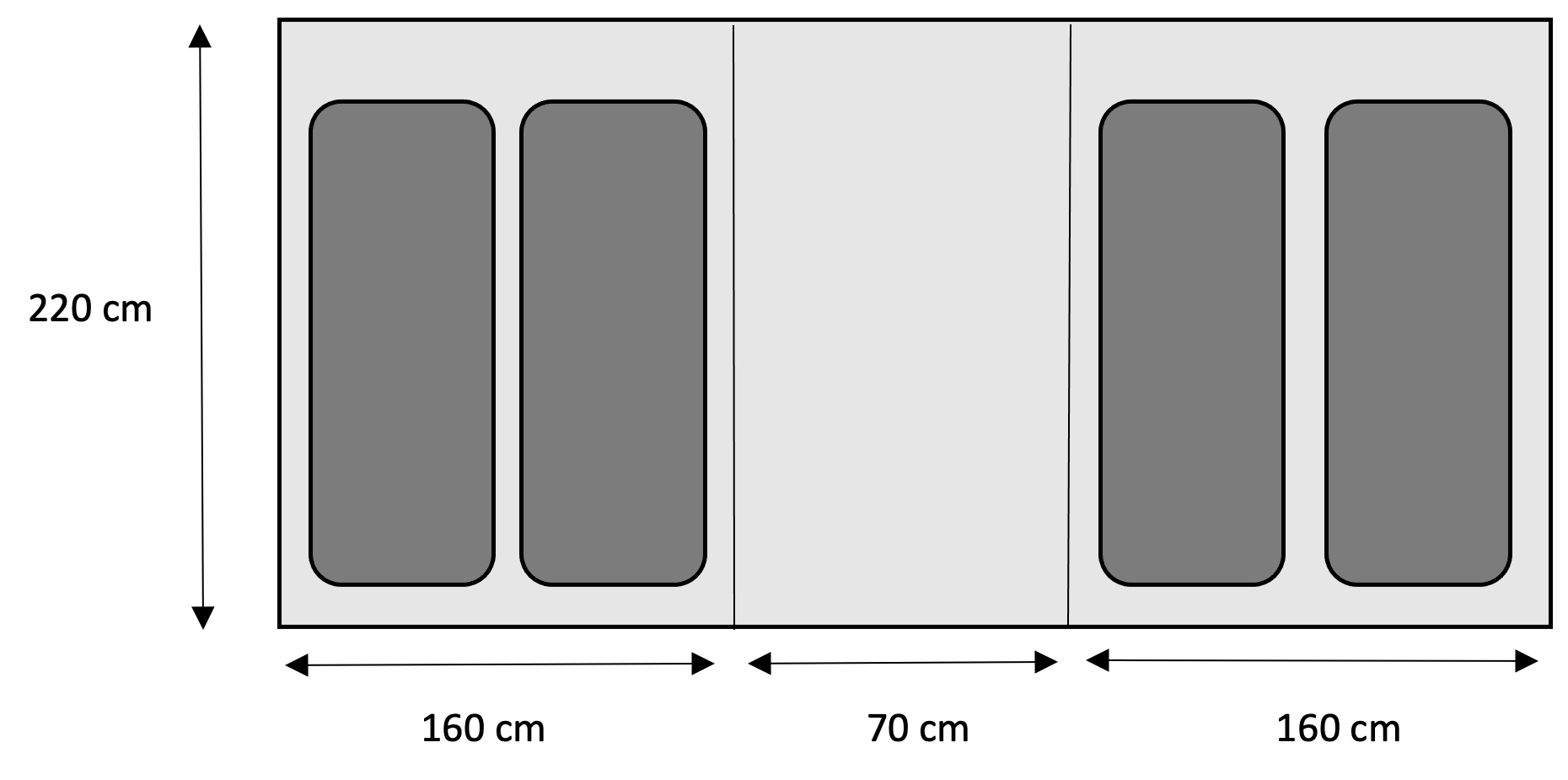 Dvs. to luftmadrasser fylder 146 cm ud af de 160 cm i bredden af hver teltkabine. Så der er 14 cm tilbage i bredden og 29 cm i længden i teltet.
