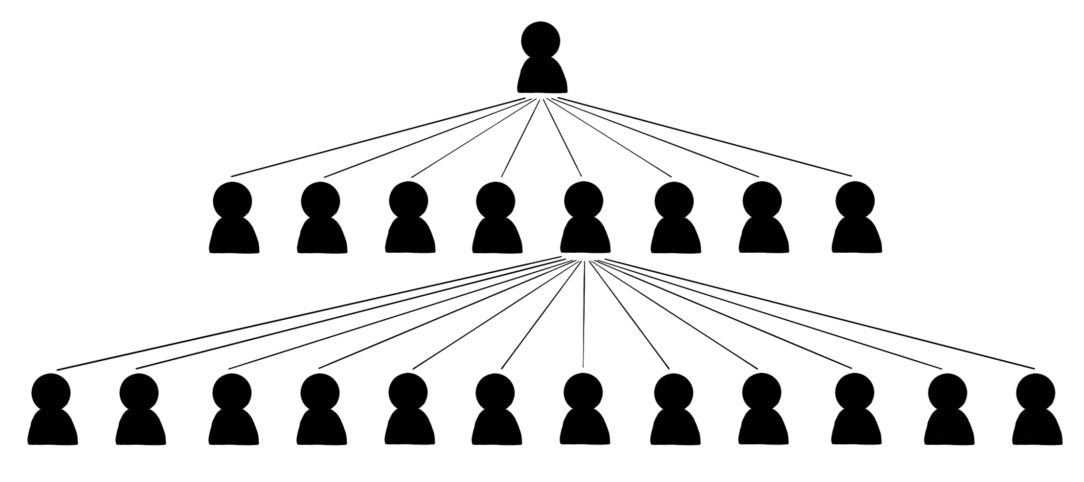 Vi har taget udgangspunkt i en opdigtet virksomhed, der har én direktør, otte mellemledere, og 100 medarbejdere. Så er hver mellemleder leder for 12-13 medarbejdere. Generelt er der flere mænd end kvinder i ledelsen af en virksomhed. Derfor er direktøren og seks af mellemlederne i vores fiktive virksomhed mænd, og to mellemledere er kvinder. Ud af medarbejderne er der lige mange mænd og kvinder.