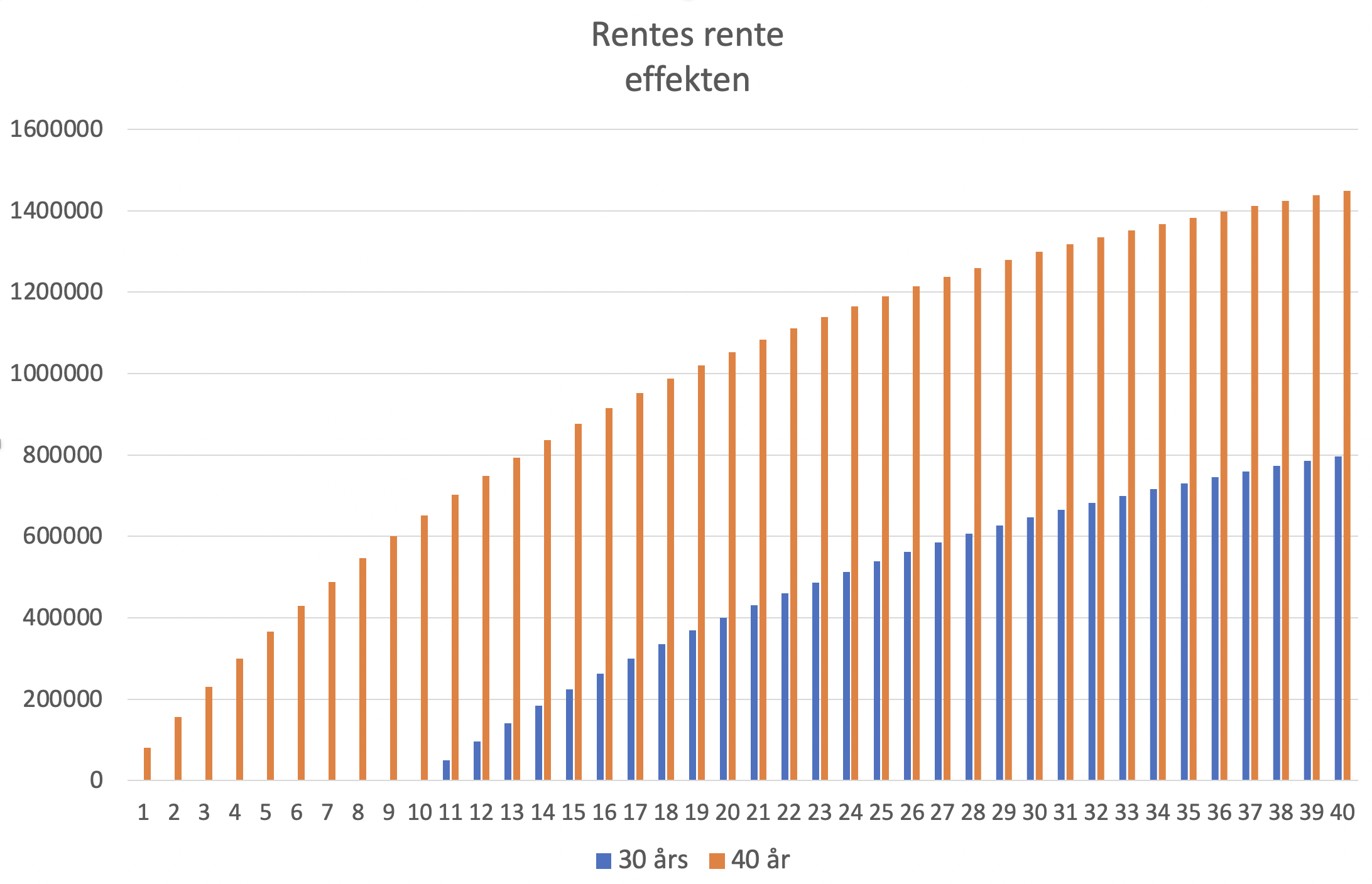 Det ses derfor her, at rentes rente effekten ikke bare er småpenge, men faktisk er en markant større opsparing.
