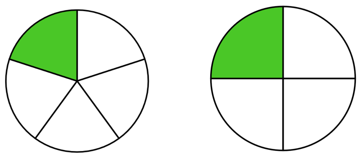 Her har vi fx tegnet \(\frac{1}{5}\) og \(\frac{1}{4}\) i cirkeldiagrammer.