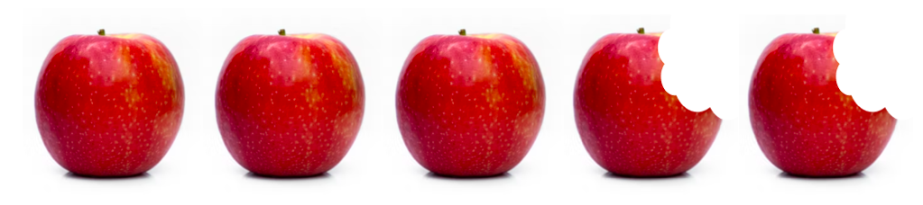 Der er 5 æbler, og du spiser 2 af dem. Du har nu spist 2 ud af 5, hvilket vi også kan skrive som brøken \( \frac{2}{5} \) (to femtedele).