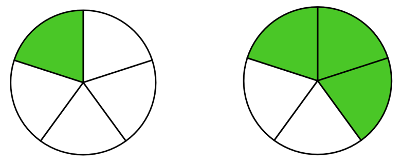 Diagrammet til venstre viser \( \frac{1}{5} \) (en femtedel) og diagrammet til højre viser \( \frac{3}{5} \) (tre femtedele). Diagrammerne i sig selv er ikke et problem. Problemet opstår når vi skal regne med brøker. Hvad sker der for eksempel når brøker lægges sammen? I ovenstående tilfælde viser de to diagrammer tilsammen \( \frac{1}{5} + \frac{3}{5} = \frac{4}{5} \) (fire femtedele). Men nogle børn læser diagrammerne anderledes. Børnene ser, at der er 10 felter i alt og at fire af dem har farve. De tror altså at diagrammerne viser \( \frac{4}{10} \) (fire tiendedele) og kan komme til at tro at \( \frac{1}{5} + \frac{3}{5} = \frac{4}{10} \), hvilket ikke er rigtigt. Denne forvirring opstår gerne fordi børnene kun er nået til forståelse nummer 1 i listen fra afsnittet ”Hvad er en brøk?”.