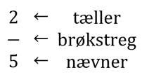 Når man skriver \( \frac{2}{5} \) (to femtedele), så er det en måde at skrive et divisionsstykke på, som man ikke har udregnet endnu. I dette tilfælde betyder det, at 2 skal divideres med 5.