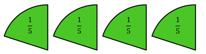 - At ovenstående diagrammer kan forvirre, handler om at børnene tæller alle felterne, men faktisk bør de bare tælle de farvede felter og huske, at ét felt svarer til \( \frac{1}{5} \). Der er 4 felter, der svarer til \( \frac{1}{5} \) hver, altså fire femtedele.
