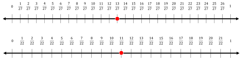 De første brøker dit barn lærer, er typisk det vi kalder ægte brøker. I ægte brøker er tælleren mindre end nævneren, fx \( \frac{1}{2} \) eller \( \frac{1}{4} \) eller \( \frac{7}{18} \). Alle ægte brøker svarer til et tal mellem 0 og 1 når vi skal placere dem på en tallinje.
