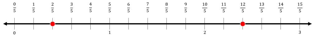 Når brøker forstås på denne måde, behøver nævneren ikke at være størst. Fx er brøken \( \frac{12}{5} \) (tolv femtedele) større end 1. På nedenstående tallinje har vi markeret både \( \frac{2}{5} \) og \( \frac{12}{5} \). Læg mærke til at tallinjen går op til 3.