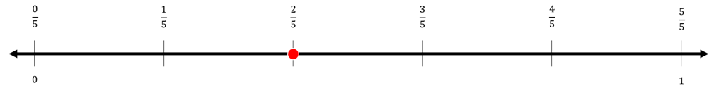 En brøk er et tal, der kan placeres på en tallinje. Fx ligger brøken \( \frac{1}{2} \) (en halv) lige mellem 0 og 1. På den måde beskriver brøker nogle tal, der ligger mellem hele tal. På samme måde kan \( \frac{2}{5} \) (to femtedele) placeres på en tallinje sådan her: