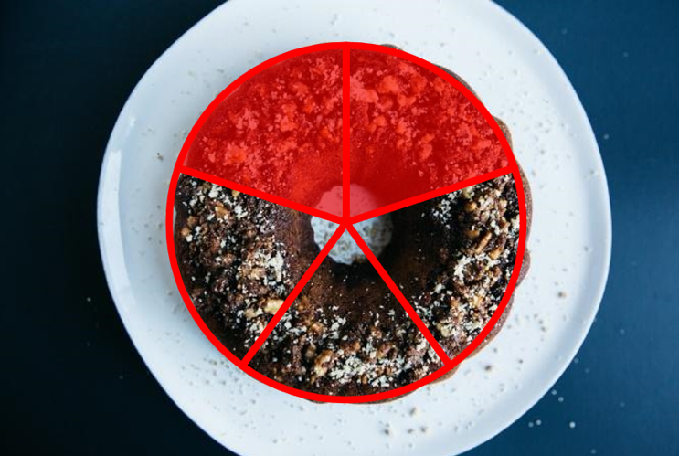 Brøken \( \frac{2}{5} \) (to femtedele) kan også betyde en del af én ting, som er delt op i lige store stykker. Fx en kage, der er delt op i fem stykker, hvor to af stykkerne er blevet spist. Det væsentlige er, at der er 1 kage og ikke 5 kager som i ovenstående forståelse.