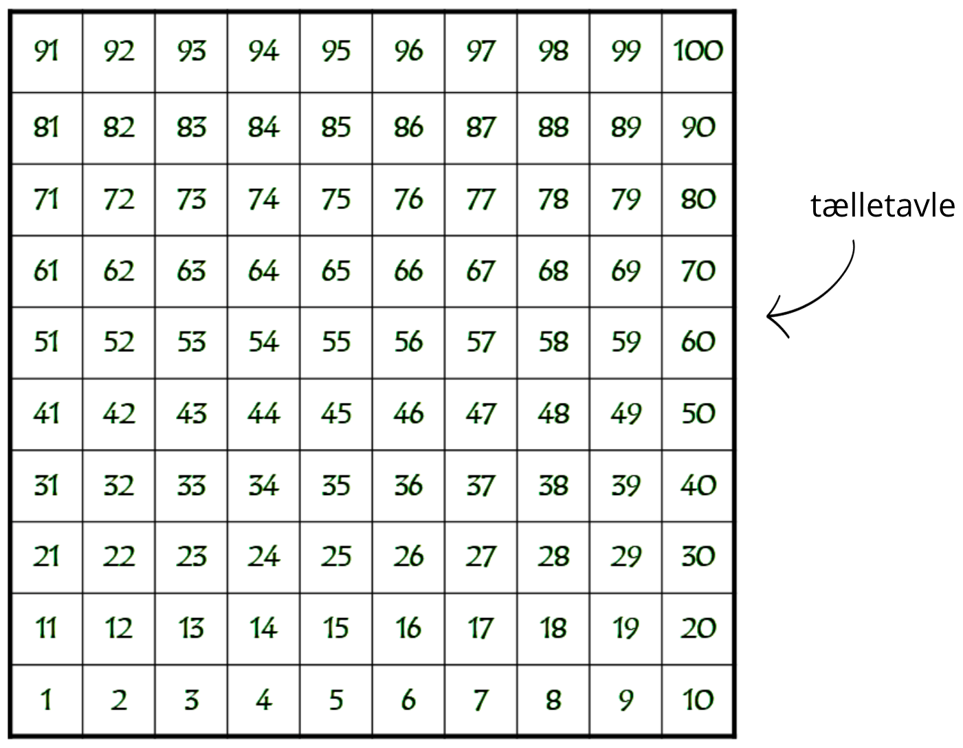 - Spille terningespil med en tælletavle (hvor det gælder om at komme først, og måske har genveje som spillet Snakes & Ladders).