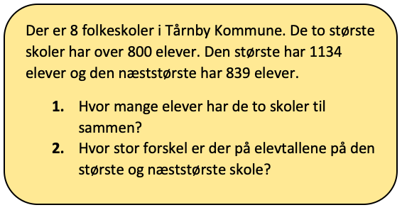Læg mærke til, hvor meget mere tekst der er i opgaven til 4. klasse. Dit barn bliver altså meget afhængigt af at være god læser. At være god læser handler ikke kun om at kunne afkode hvert ord, men også om at kunne forstå sætninger og at vide meget om verden, som kan være med til at skabe mening i teksten. Dit barn skal fx kunne gennemskue, at ’til sammen’ handler om, at man skal lægge sammen, og at ’forskel’ betyder, at man skal trække nogle tal fra hinanden. Derudover kræver opgaven i eksemplet, at dit barn har en idé om, hvad kommune er og at Tårnby er et navn, fordi det begynder med stort bogstav.